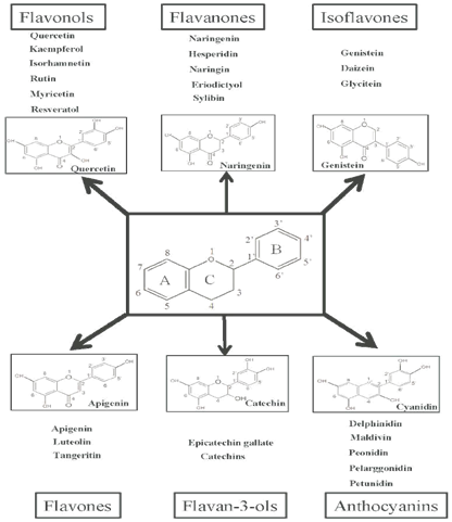 Flavonoids are grouped into six classes, including flavanone, flavonol, flavone, isoflavone, flavan-3-ols, and anthocyanin.17 The core chemical structure of flavonoids comprised of two benzene rings (ring A and B) linked to a pyran ring (ring C) by a three-carbon bridge.18 The antioxidant activity of flavonoids depends on the location of the B ring on the C ring and the number and placement of hydroxy groups on the B ring. These hydroxy groups help to stabilize free radicals by donating electrons and provide antioxidant protection to the cells.19 General chemical structures and classification of flavonoids is shown in Figure 2.