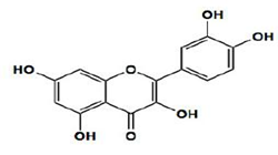 Quercetin molecules contain a basic flavonoid core that has one hydroxyl group located on position 3 of ring C, two hydroxyl groups on positions 3 and 4 of ring B, and two more hydroxyl groups on positions 5 and 7 of ring A.22 Additionally, a carbonyl group substituent is attached to carbon 4 of ring C. In Figure 3, the chemical structure of quercetin is illustrated.