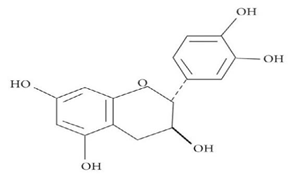The catechin molecule contains a basic flavonoid base structure similar to quercetin. However, unlike quercetin, catechin lacks a carbonyl group and a double bond located between positions 2 and 3 of ring C. In Figure 4, the chemical structure of catechin is illustrated.