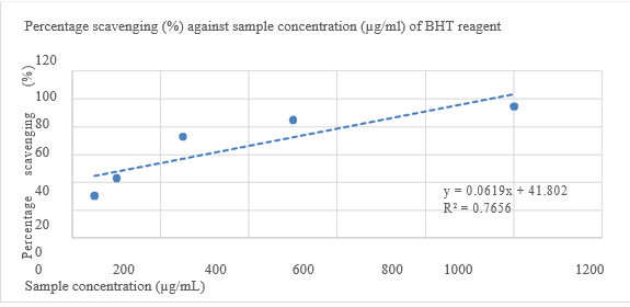 Percentage scavenging (%) against sample concentration (mg/mL) of maceration extract with ethanol is given in Figure 6. Each BHT reagent concentration with its absorbance value and each BHT reagent concentration with its percentage scavenging shown in Table 5.