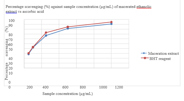 Figure 8 Percentage scavenging (%) against sample concentration (µg/mL) of macerated ethanolic extract vs Ascorbic acid.