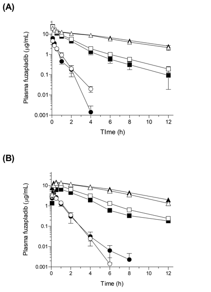 Figure 1 Pharmacokinetic behaviors of fuzapladib sodium monohydrate (2.0 mg/kg body weight) in rats, cats, and dogs following (A) intravenous and (B) subcutaneous injection. ●, male rats; ○, female rats; ■, male cats; □, female cats; ▲, male dogs; and △, female dogs. Data represent mean±SE of 4–5 experiments.