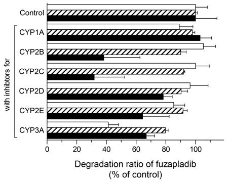 Absorbed drugs can be distributed reversibly to various tissues of the body including the eliminating organs, such as liver and kidney, resulting in a decrease in blood drug concentration. Marked species differences in clearance of fuzapladib prompted us to perform preliminary studies on metabolism of fuzapladib in each animal species. In the present study, after incubation with liver S9 fractions of each species for 60 min, fuzapladib underwent enzymatic degradation, gradually; decreasing by ca. 38% for rat, 48% for cat, and 17% for dog liver S9 fractions, respectively (data not shown). To clarify the possible contribution of various CYP isoenzymes in the hepatic metabolism of fuzapladib, the potent inhibitors for CYP 1A (α-naphthoflavone), 3A (ketoconazole), 2B (ticlopidine), 2C (phenytoin), 2D (quinidine), and 2E (disulfiram) were added to reaction mixture and subjected to the chromatographic analyses. Some CYP inhibitors attenuated the enzymatic degradation of fuzapladib significantly (Figure 2). Significant inhibition on the enzymatic degradation was seen for CYP 2E (ca. 15%) and 3A (ca. 59%) inhibitors in the rat liver S9 fraction and for CYP 3A inhibitor (ca. 20%) in the cat liver S9 fraction. Interestingly, in the dog liver S9 fraction, all the CYP inhibitors tended to attenuate the degradation of fuzapladib, and, in particular, CYP 2B and 2C inhibitors achieved ca. 40% reduction in the degradation of fuzapladib. Although the contribution of other CYP isoenzymes remains unknown, metabolism of fuzapladib appears to be different among species.