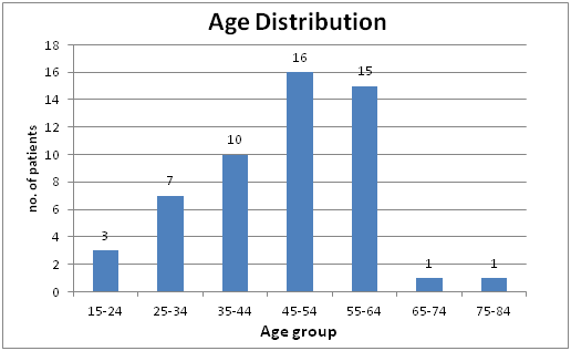The most common age group was 45-54years with 16 cases (30.18%), then 55-64years with 15 cases (28.30%). This shows that breast carcinoma is high between 45 to 60years of age and found least below 40years in Pakistan (Figure 1). There were 45.2% patients identified to have positive hormone receptor status. Besides, 35.84% patients had carcinoma of the right breast. Those diagnosed with ER-positive status were 11.32%, HER2-neu over-expression 7.54%, ER/PR receptor-positivity (or luminal A) 16.98% and 3.77% were ER/HER2-neu positive, 1.88% was PR/HER2-neu positive and 1.88% was triple positive while none of them showed positivity for HER2, 23 patients were positive for all the three receptors. These cases were diagnosed at different grades including 22.64% of G1 (low grade), 39.62% of G2 (intermediate grade), 26.41% of G3 (high grade) and 11.32% of G4 (undifferentiated). Combined chemotherapy and radiotherapy was prescribed in 52% cases, only chemotherapy in 18% and chemotherapy and hormones in 9 patients. Mastectomy and auxiliary clearance was done in 60% patients. Chemotherapy with Fluorouracil, Adriamycin and Cyclophosphamide (FAC) was recommended to 62.2% patients, while Taxol, Adriamycin and Cyclophosphamide (TAC) to 33.5%. Fluorouracil, Epirubicin, Cyclophosphamide (FEC) was prescribed in 0.06%, Tamoxifen to 0.01% and herceptin to 0.09%. About 66% patient were diagnosed as Stage III, 26.41% as Stage II and 3.77% patients were as Stage IV and 3.77 as Stage I as well. Infiltrating ductal carcinoma with nonspecific features was the commonest type, found in 82.6% out of a total of 53. Other types included 4.35% cases of infiltrating ductal carcinomas of papillary type, 2.17% of mucinous type and 2.17% of medullary type, 6.52% of invasive lobular carcinoma and 1.88% case of mixed lobular and ductal carcinoma. Two patients presented with metastasis in the breast having primary tumor elsewhere. One of these patients had choriocarcinoma and the other had non-hodgkin’s lymphoma. These patients were excluded from the study. Some other information which was recorded from patients was as follow.
