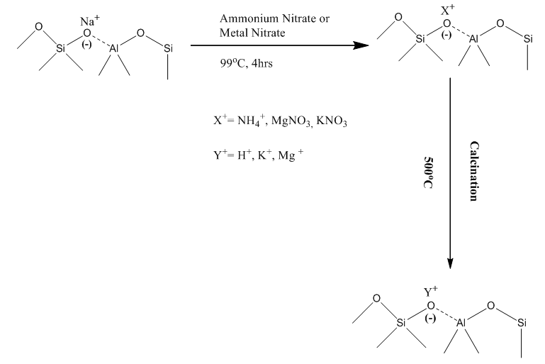 Na- form of calcinated Zeolite A was converted into various ion exchanged metal forms by exchanging Na+ ion present on the parent zeolite with other alkali metal ions such as K+, Mg+ by stirring zeolite material in alkali metal solutions. A mixture containing 5 g of Zeolite-A and 144 mL of 0.0125 M metal nitrate (MgNO3, KNO3) was then stirred at 80oC for 24 h. Then the material was recovered by filtration and washed 2-3 times with distilled water. Finally the required sample was dried for 12 h at 120 oC and calcined at 450 oC for 4 h (Figure 1).