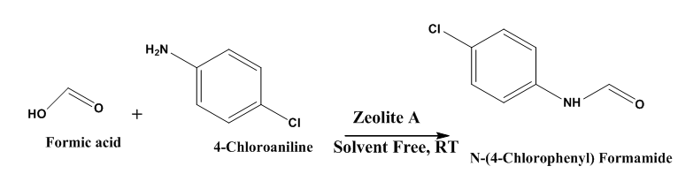 A mixture of 4-Chloroaniline (1.0 mmol), aq. formic acid (1.2 mmol) and Zeolite A (0.05 g) in a 25 ml conical flask was stirred under solvent free conditions at room temperature for appropriate time (as shown in Figure 1). After reaction was completed (monitored by TLC), ethyl acetate was added and the catalyst was removed by filtration. After removal of solvent, the product was further recrystallized with suitable solvent such as (ether or chloroform). The product structure was confirmed by HNMR, FTIR and compared with samples already obtained by reported methods (Figure 2).