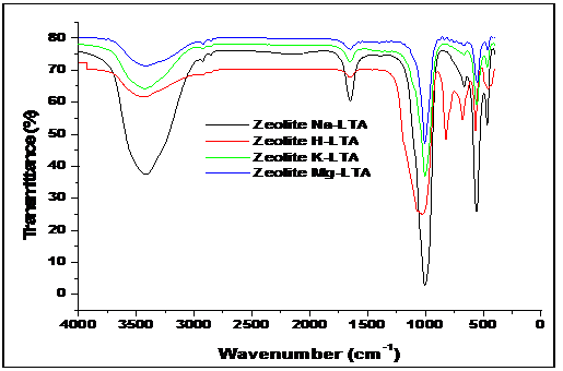 The FT-IR spectrum of calcined zeolite-A, its H form and metal ion exchanged forms are shown in Figure 5. FT-IR spectrum of calcined zeolite-A shows absorption bands at 450 cm−1 which is attributed to Si, Al-O band, and those around at 1000 cm−1 and 750 cm−1 are, respectively, attributed to symmetric and asymmetric stretches of the zeolite framework. A band peak for the OH group is clearly observed at 3400 cm−1. It is clearly observed from Figure 5 that the FT-IR spectrum of H form and metal ion exchanged forms of zeolite-A are similar to the FT-IR spectrum patterns of its parent zeolite-A. (Black line in Figure 5 shows FT-IR spectrum of parent zeolite-A)