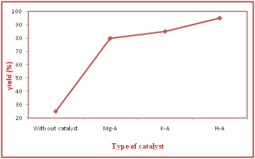 We have developed a simple, efficient and excellent method for the synthesis of N-Formylation of amines under solvent free condition at room temperature in presence of catalyst H-zeolite A. So the model reaction was carried out between 4-Chloro aniline and Formic acid (Figure 1). Without catalyst, reaction product 25% yield was obtained when the mixture was stirred for 100 minutes. However when the catalyst (0.05g) was added to the reaction mixture, the reaction occurred in 15 minutes resulting in 95% yield. It shows that catalyst plays an efficient role in the reaction. The efficiency of model reaction was experimentally tested on various catalytic forms such as H-form of Zeolite A, Mg form of Zeolite A and K form of Zeolite A. The results are shown in Figure 6.
