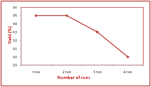The reusability of the catalyst is the most important tool and makes it very useful for commercial applications. After the reaction was completed , the catalyst was seperated by simple filteration and then H-form of Zeolite A was washed 2-4 times with ethylacetate and chloroform and dried in an oven at 120oC for 8 h. The catalyst was used in several runs as shown in Table 2 (Figure 8). The small change in the catalytic activity after 3 cycles is mainly due to reduce catalyst structure during recovery process. It shows that the catalyst could be recycled several times without much loss in their activity.