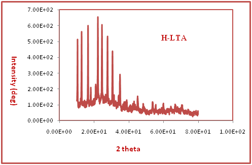 Na- form of Zeolite A was converted into H form by the following procedure: we took 9.0 g of Zeolite A, 7.23 g of NH4Cl and 13.80 mL of distilled water and these three components were then mixed with 0.1M hydrochloric acid solution so as to maintain the pH 4 of the solution. The mixture was stirred at 60oC for 6 h. After that the required material was filtered and washed 2-3 times with distilled water. After filtration and washing with distilled water chlorides were removed then NH4-zeolite was placed in an oven at 60oC for 24 h. Finally the ammonium form of Zeolite-A was converted into the H form by calcination over 60 min at 500oC.
