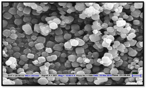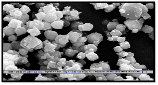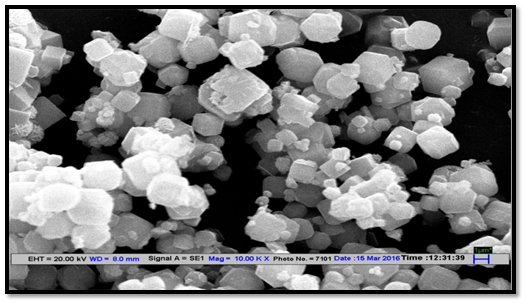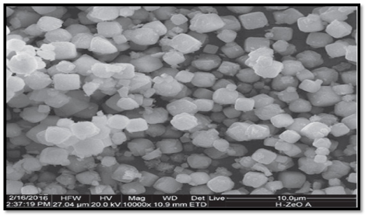 SEM images of calcinated zeolite A, H-form and metal ion exchanged form were obtained by using SEM instrument. SEM images of these materials were taken at 10,000 x magnifications to show their surface morphology and to obtain the clear view of crystals.