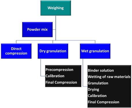 The main steps for manufacturing oral solids are direct compression, dry granulation and wet granulation. The direct compression process provides greater productivity, however, due to limitations inherent to the formulation, it is necessary to use dry or wet granulation (Figure 1).1-3