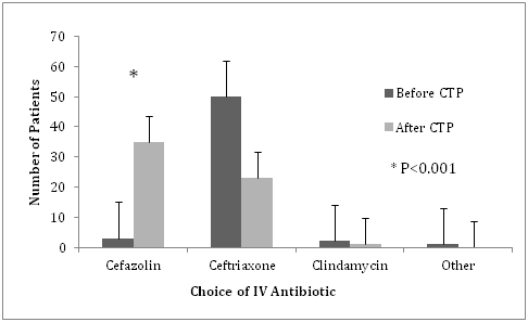 In the pre-CTP arm, there were 54 patients that received IV antibiotics, consisting of cefazolin (3), ceftriaxone (50), clindamycin (2), and Levofloxacin (1). There were two patients in this arm that received double coverage with clindamycin, and Levofloxacin, respectively, in addition to their cephalosporin. The median duration of IV therapy in the pre-CTP group was 4 days (Table 2). In the post-CTP arm, there were 59 patients that received IV antibiotics, consisting of cefazolin (35), Ceftriaxone (23), and clindamycin (1). The median duration of IV therapy was 3.5 days (Table 2). There was a statistically significant increase in the use of cefazolin, 3 patients versus 35 patients (p<0.001), corresponding to a 53.8% absolute increase, after the introduction of the CTP. There was also a statistically significant decrease in the use of Ceftriaxone, 50 patients versus 23 patients (p<0.001), corresponding to 53.7% absolute decrease, after the introduction of the CTP (Figure 1).