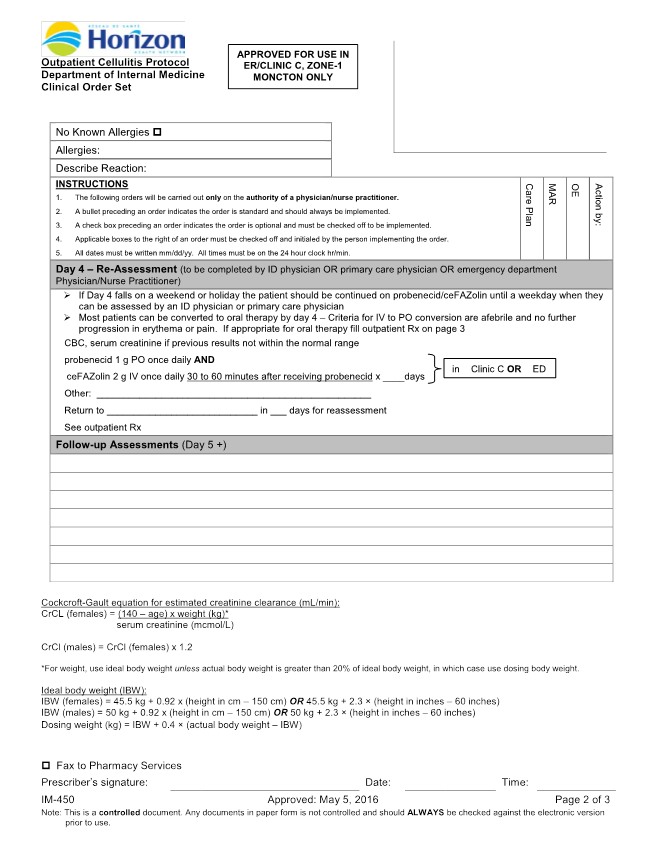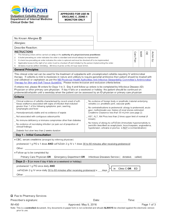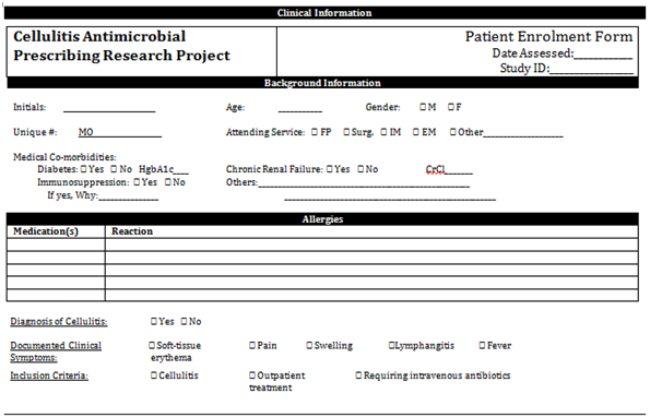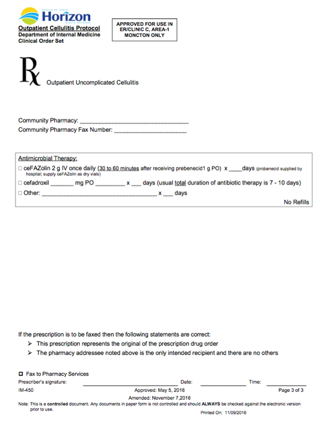 This is a retrospective before and after intervention study. The goal was to identify at least 50 patients that received intravenous antibiotics both before and after the intervention. The before intervention analysis consisted of a retrospective chart review identifying patients that were discharged from the Emergency Department at The Moncton Hospital with a diagnosis of cellulitis which was considered severe enough to require the patient to return daily for intravenous antibiotics. A clinical treatment pathway for the outpatient management of cellulitis with intravenous antibiotics was produced and made available before the second half of data collection. The treatment pathway had defined usage criteria, exclusion criteria, and outlined management using once daily cefazolin plus probenecid (Appendix 1). The inclusion and exclusion criteria of the chart review aligned with the treatment pathway to assess its applicability. A standard data collection form was used to collect demographics, co-morbidities, antimicrobial treatment, inclusion/exclusion criteria, treatment failure, rates of C. difficile infection, and use of the CTP (Appendix 2). The chart review identified patients from September 2015 to February 2017. The CTP was made available in May 2016, along with hospital promotion and physician education. Prior to release of the CTP, feedback was obtained from the Departments of Family Medicine, Internal Medicine, Emergency Medicine, and Pharmacy.