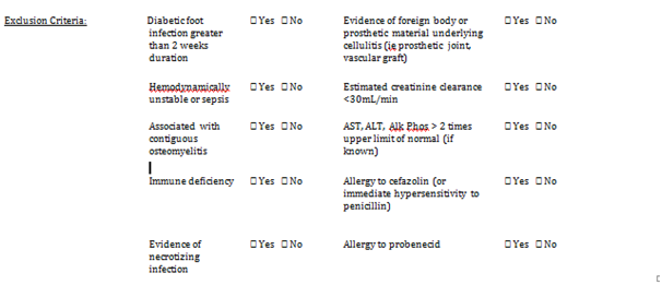 In an effort to reduce unnecessary use of broad spectrum antibiotics there has been a push to use once daily cefazolin with probenecid in treating outpatient cellulitis. Probenecid is a uricosuric agent that inhibits the renal clearance of cefazolin thereby prolonging its half-life.16 Studies have shown that in combination, cefazolin concentrations remained above the minimum inhibitory concentration for the twenty-four hour dosing interval.17‒19 This leads to a reduction in the number and frequency of intravenous infusions and also leads to less resource utilization. There have been two randomized controlled trials to date that compared the efficacy of once daily cefazolin plus probenecid versus once daily Ceftriaxone in the management of outpatient cellulitis. Both authors concluded that once daily cefazolin plus probenecid was equally efficacious compared to Ceftriaxone.20,21 Many Emergency Departments in Canada have adopted this approach to managing outpatient cellulitis requiring intravenous antibiotics.2 A separate retrospective study identified chronic venous disease as a risk factor for treatment failure with once daily cefazolin plus probenecid.22