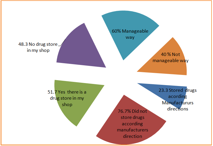 Effective drug handling and drug management are crucial for the safety of both patient and public. It can be seen from this chart (Figure 3) that (76.7%) of pharmacists in our sample and those who sell medication in the region have reported that they do not store the medicine according to manufacturer’s recommendations. Only (23.3%) have followed the guidelines of manufacturers. As is clear from this data, the majority of pharmacists in the region are using their own method for storing, lacking proper guidance from the Ethiopian authority. This could lead to drug-resistance and the poisoning of vulnerable people and animals in the region if no immediate intervention is taken.
