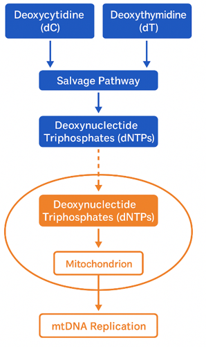 Nucleoside supplementation using deoxythymidine (dT) and deoxycytidine (dC), key substrates for mitochondrial DNA replication. |