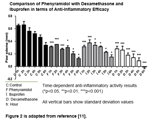 Phenyramidol exhibited statistically significant higher analgesic efficacy than thiocolchicoside and acetylsalicylic acid, with the commercial fluorometric inhibitor screening test kit for anti-inflammatory activity and paw edema tests, It was observed that Phenyramidol exhibited anti-inflammatory activity equivalent to Ibuprofen and Dexamethasone, and provided balanced inhibition of the enzyme cyclooxygenase (Figure 2). It has also been reported in the study that Phenyramidol provides a statistically significant decrease in interleukin (IL) 1β and tumor necrosis factor (TNF)-α (cytokine) levels.11