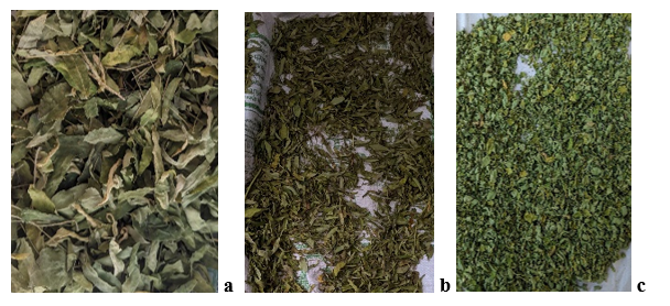 Figure 13 Moringa leaves in the drying process: (a) M. drouhardii, (b) M. hildebrandtii, (c) M. oleifera.