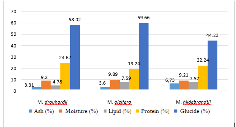 Lipid content varied significantly among the three Moringa species, with M. hildebrandtii exhibiting the highest lipid content (17.57%), followed by M. drouhardii (7.59%) and M. oleifera (4.78%). Lipids play crucial roles in various physiological processes. They serve as an important energy reserve, providing more than twice the energy per gram compared to carbohydrates or proteins. Lipids are vital energy sources, providing more energy than carbohydrates or proteins. They serve as precursors for hormones and signaling molecules. Lipids are also crucial for vitamin absorption and membrane structure (Park et al., 2021).