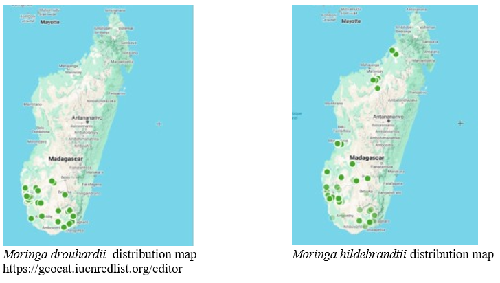 The cartographic representations delineate the geographic distribution of the Malagasy endemic species Moringa drouhardii and Moringa hildebrandtii, contrasted with the cosmopolitan Moringa oleifera.