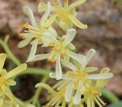 Inflorescences are arranged in axillary panicles, attaining lengths of up to 30 cm. Each panicle bears numerous bisexual, actinomorphic, and fragrant flowers. These flowers exhibit a whitish-yellow coloration and a cup-shaped morphology, with pedicels measuring 1 to 2 mm in length. The sepals, glabrous in nature, measure 5 to 6 mm in length and 1.8 mm in width. The oval-shaped petals, measuring 7 to 10 mm in length and 1.8 mm in width, are glabrous on the exterior surface and exhibit slight pubescence on the interior. The filaments, characterized by strong pubescence, measure 6 to 8 mm in length. Au cactus Francophone, 2008.