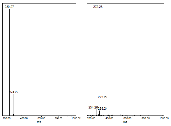 Using UPLC-PDA, the compounds exhibit absorption peaks around 236-248 nm, 266-277 nm, and 311-338 nm, which are characteristic of the polyphenol class (Figure 1). Positive ESi-MS analysis (Figure 3) revealed several bioactive N-alkylamides, such as dodeca-2Z,4E-diene-8,10-diynoic acid isobutylamide (RT 21.11 min, molecular weight 243 Da, a protonated [M+H]+ ion at m/z 244 Da), undeca-2E,4E-diene-8,10-diynoic acid isobutylamide (RT 27.98 min, molecular weight 229 Da, a protonated [M+H]+ ion at m/z 230 Da), and anacycline (RT 28.76 min, molecular weight 271 Da, a protonated [M+H] + ion at m/z 272 Da). Figure 5 illustrates the MS protonated [M+H]+ ions at m/z values of 230 and 272 Da, respectively. The structures of several N-alkylamides in the ethanolic extracts of Achillea species, namely A. millefolium and A. ptarmica, which are thought to play a role in their pharmacological effects, were characterized using HPLC-ESi-MS/MS and GC-EI-MS.8