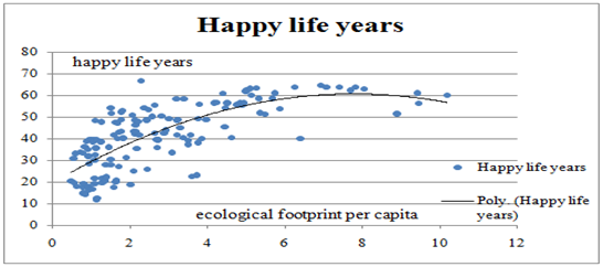 Graph 1 The non-linear relationship between Happy Life Years (HLYE, vertical Y) and ecological footprint (horizontal X), n=140 countries in 2005.
