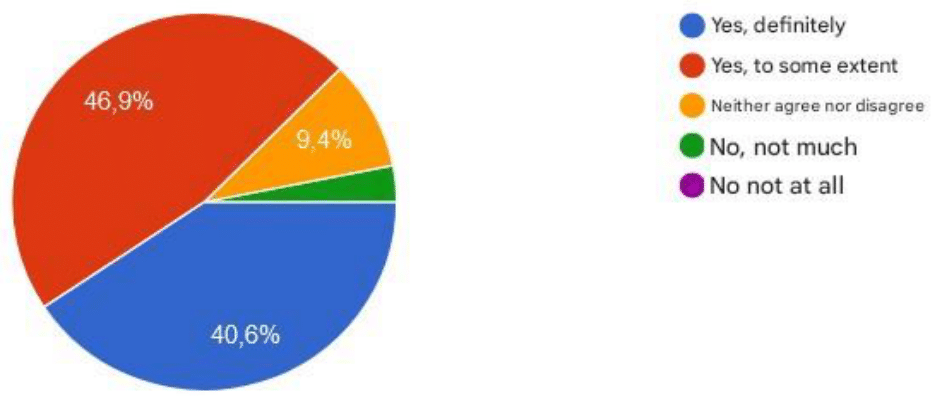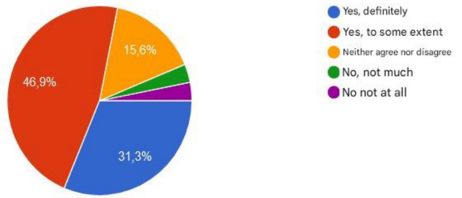 Regarding the usefulness of using simulators in the learning process of the surveyed students, 46.9% said yes to a certain extent, 40.6% yes definitely, 9.4% neither agree nor disagree and 3.1% not very much. As can be seen in Figure 1.