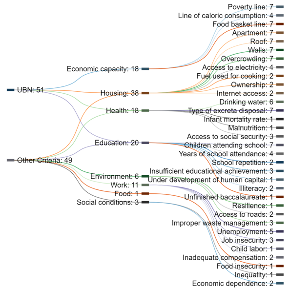 This UBN methodology should work as a common frame for the operationalization of the concept of poverty, however, as will be seen in the Sankey diagram and the regional matrix, this does not happen. This results in the fact that the data on poverty in the region are true and accurate by the methodology with which they are collected, but with different meaning given the operationalization that each country uses when disaggregating dimensions and subdimensions for poverty.