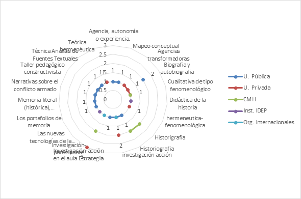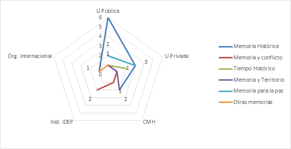 The experiences of Pedagogy of memory analyzed show that there is a greater interest in studying the relationship between History and Memory, as well ashe Public University has 0.6% publications with the study of the Historical Memory category; the Private University has 0.3% publications with the category of historical memory, the CMH has 0.2% publications with the central category of historical memory, the Inst. IDEP has 0.2% with the category of memory and conflict and, International Organizations 0.1% with other reports.