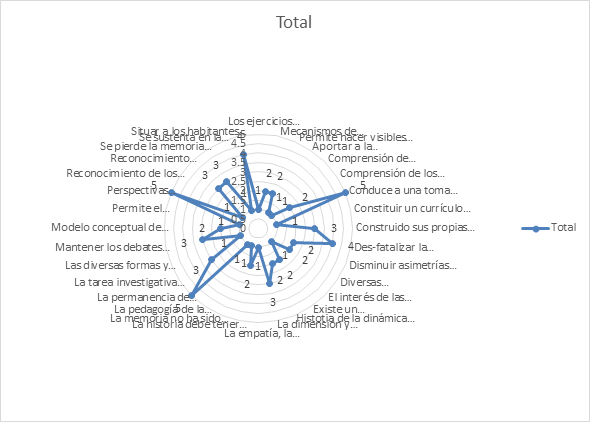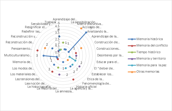 The category of Historical Time has as an alternative position 0.2% critical historiography, 0.2% learning historical time, 0.1% Resignifying the role of history from another perspective; while the Category Memory and territory, has 0.3% establish the criteria to challenge falsifying memories, 0.3% the history of the territory, 0.2% lack of interest in national history. The central category Memory for peace, has as an alternative position 0.2% the duty of memory, 0.2% ethics of teaching history, 0.2% agency and awareness for peace. Finally, in the central category Other memories, there are 0.5% Actions of oppression, 0.3% Reconstruction of resistance, 0.3% Construction of human rights archives, 0.1% Ethics of teaching history.