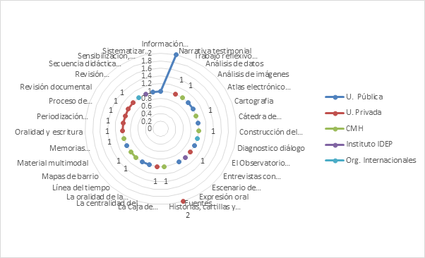 The documents of the CMH use as tools 0.1% construction of the school museum, 0.1% stories, primers and teaching material, 0.1% timeline, 0.1% personal memories and testimonies, 0.1% analysis of data, 0.1% cartography. While the IDEP Institute uses 0.1% collective memory construction scenarios and international organizations use 0.1% dialogical diagnosis, 0.1%, the didactic sequence with testimonies.