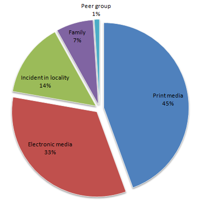 Out of 200 respondents, 45% got the information about honour killing from print media (newspaper, magazine, journals etc) , 33% of the respondents got the information from electronic media ( Television, radio, social sites etc), 14% got the information from their locality, 7% of the respondents got the information from their family and 1% from peer groups.