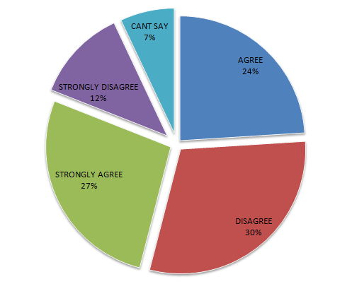 When the respondents were asked whether the above mentioned reasons/reason give a person or a family member right to kill a person then the response came as a shock to the researcher because 51% agreed amongst which 27% strongly agreed making this view a stronger view of the general public which was generally not expected by the researcher. These statistics came as an eye opener to the pre conceived notion of the maximum people who have studied about it or who research on such topic. 51% means more than half of the respondents which makes it superior view and gives a clear picture of the society which still believe in elimination the person from the society totally than adopting his/her ways or his/her way of living. This percentage defends the statement that “You are not living alone, but you live in a society”. 42% disagree and believe that these reasons don’t give right to any person to kill another person and amongst this percentage 12% strongly disagree with such a statement. 7% of the respondents didn’t comment on it and gave a response which was Can’t Say (Figure 5).