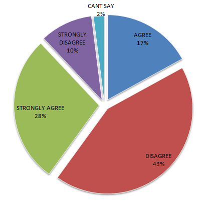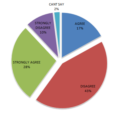 17% respondents agree with this fact that the exsisting laws on honour killing are sufficient, 28% strongly agree with the statement that existent laws are sufficient, 43% disagree with the statement that exsisting laws on honour killing are sufficient, 10% strongly disagree with the statement and 2% of the respondents were not able to say anything.