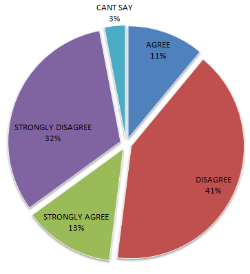11% respondents agree with the fact that a family member has a kill the person who brings dis honour to the family, 13% strongly agree with this fact, 41% disagree with the statement that honour killing should be done by a family member of a person who brings dis honour to the family, 32% strongly disagree with the statement and 3% of the respondents have no opinion or answer to this question.