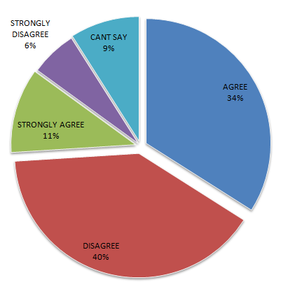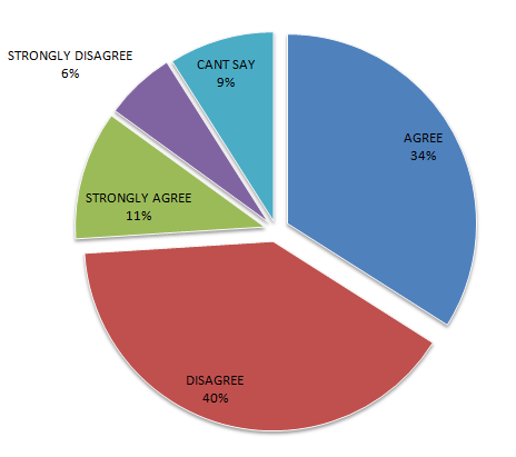 When response was sought over the statement that existing laws are implemented properly than 75% respondents disagreed and amongst which 40% of the respondents strongly disagreed and believed that the existing laws are not implemented properly and reasons can be many life corruption, delayed cases, political pressure, social stigma etc. Majority is of the opinion that the prevailing laws with respect to honour killing need better implementation because how good a law may be, is totally useless if not implemented properly.15% agree that the implementation of law is proper and 10% being unaware of the law or its implementation choose the option Can’t Say (Figure 15).