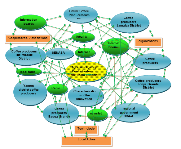 Based on this structure, the different actions of the innovation networks can be configured, identifying the actors, coffee producers, among others, Information and Communication Technologies: Distributed Systems and Platforms (GRID) or mobile services; as well as the contents of the information: another value of modern society, it can be shaped and made available to more people, it can be updated and generated by different groups in a far-reaching collaborative process (use of mail, chat, text messaging, text and the editorial possibilities of the web, blog, etc.), as well as the modeling of the agricultural information system in the province of Utcubamba that allows coffee producers to make decisions in real time.