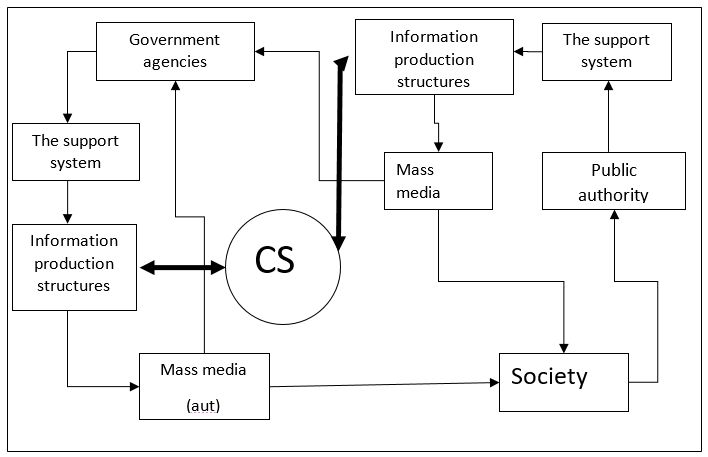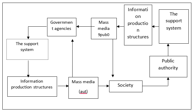 Support system in Scheme 2, this is the infrastructure that is necessary for the full functioning of mass communication: the appropriate level of development of the economy, technology, technology, science and scientific and technical developments, the legal and regulatory framework, the system of training and retraining of professional personnel, etc.