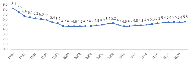 The net minimum wage is another important indicator of social policy. The real value of the real net minimum wage had a downward trend in the 1989-2023 time horizon (Chart 3), reaching a maximum level in 2000 of 24%, i.e. a quarter of food, non-food and services goods that could be purchased in the base year, 1989. The situation has improved since 2009 and then decreased again by 2013. The period of global economic crisis affected all categories of employees, but especially those paid at the level of the minimum wage. The value of the minimum wage indicator in 2023 increased as a result of political decisions, reaching a value of 171% compared to the 1989 calculation base.