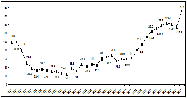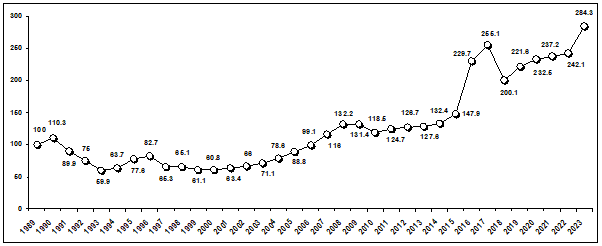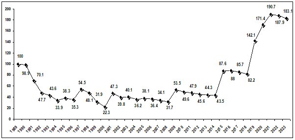 Chart 2 Dynamics of real net average wage, October 1989–2023 (1989=100%).