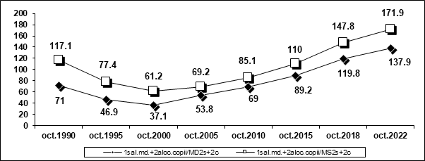 The incomes of various families with children could not keep up with the price increases for products and services on the market. This has led over time to a deterioration in the quality of life of these families. Situaţia este critică și pentru cuplul cu un venit format dintr-un salariu minim şi două alocaţii de copii din mediul urban. Acest venit nu a acoperit nici minimul de subzistenţă. Between 1991 and 2015, the income described did not cover half of the decent living minimum of the reference year, 1989.