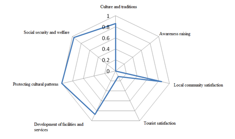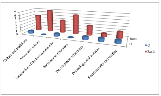 Table 10 shows the calculation of Q value and final ranking of options in terms of sociocultural dimensions (Figure 2, 3): Based on the calculations in which S is the distance between i and the ideal solution for the best combination and R as the distance from the ideal negative solution 0 is the worst combination. In the case that V >0.5, the Qi index has maximum agreement and V<0.5 means the equal group agreement. The results of the ranking indicate that protection of cultural patterns (R=0.713, S=0.250, & Q=1) occupies the first place of in terms of its contribution to sustainability, social security and welfare Q=0.969) is ranked as the second most important factor, the development of facilities and services (Q =0.869) is ranked third, the satisfaction of the host community (Q=0.89) is ranked forth, culture and traditions (Q=0.858) is ranked fifth, tourist satisfaction (Q=0.108) is ranked sixth, and awareness raising (Q=0.000) is ranked seventh in terms of its contribution to sustainability of target tourism villages in the region under study. The results of the study also indicate that the position of sociocultural sustainability of the target tourism villages is undesirable in terms of awareness raising and tourist satisfaction as they were ranked at the lowest level of sustainability. In fact, the heads of families and tourism managers are expected to undermine sustainability in the area in question through unfavorable performance. In addition, the way tourism influences the local community, with a combination of positive and negative effects, is sustainable in terms of social security and welfare and the protection of cultural patterns. The functional nature of tourism shows that an unsustainable situation has been formed and the continuity of the current trend with the transition from a potentially unsustainable situation will end in unsustainability in a near future.