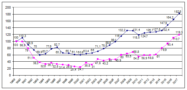 Data source: Author's graph based on the average net salary values in the economy and the price indices taken from the Statistical Yearbooks 1990-2017, INS, Bucharest.5
