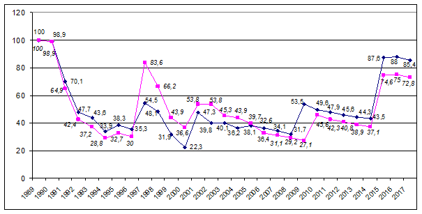 Figure 2 Dynamics of the ratio between two net average wages and allowances of two children to the minimum decent consumer basket in October, 1980-2017.