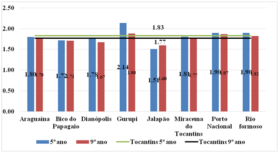 The Gurupi micro-region presents the best sócio-economic indicator in relation to the Socioeconomic Indicator of the 5th grade, but with 2.14, the index is considered regular. Then, they appear to the microregions of Porto Nacional and Rio Formoso with the rate of 1.90 (Weak) each one. The greatest disparities are found between the Jalapão (1.51), Bico do Papagaio (1.72) and Dianopolis (1,78) microregions. In relation to the Socioeconomic Indicator of the 9th grade of elementary education, it follows the same logic of the indicator of the 5th grade, but with a lower result among the microregions. The Gurupi micro-region continues to show the best rate, but below those verified in the profile of the students of the 5th grade, with 1.88 (Poor). With the exception of the Jalapão microregion, which has its socioeconomic indicator of the 9th grade (1.60) a little better than the fifth year of elementary school (1.51), the others obtained lower rates in the 9th grade, being: Araguaína with 1.78, Papagaio Bico with 1.71, Dianópolis with 1.67, Gurupi with 1.88, Miracema do Tocantins with 1.77, National Port with 1.87 and Rio Formoso 1.82. All are with socioeconomic levels considered to be weak, on the categorization scale from zero to four. This weak result in the socioeconomic profile of the students of the state education network, converges directly in the low school performance in Tocantins. As shown in Graphic 1, all microregions have very low socioeconomic levels, especially the Jalapão, Bico do Papagaio and Dianópolis microregions. These microregions, as well as transition rates in terms of approval, disapproval, abandonment and the phenomenon of age / series distortion, are the most worrying. One of the corroborating factors for this low level is linked to the high rates of illiteracy and the low level of schooling among the adult population in the mentioned microregions. These two factors already contribute substantially to school failure and failure, keeping the cyclical problem of poverty in these regions to the detriment of others.