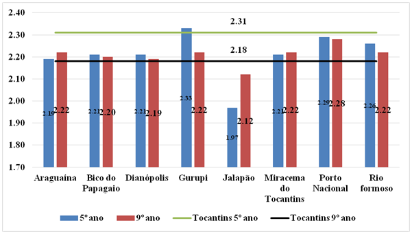 According to Figure 3, the microregion with the lowest sociocultural indicator per student in the 5th grade of elementary education is the Jalapão region with 1.97 (Low), then the micro-region of Araguaína with 2.19 (Regular). Bico do Papagaio, Miracema do Tocantins and Dianópolis meet with a rate of 2.21, with a regular indicative. The micro regions of Porto Nacional (2,29) and Rio Formoso (2,26) appear next. Although the indexes are between weak and regular, the micro-region of Gurupi stands out with the best sociocultural Indicator, with 2.33. It is important to note that this rate presented by Gurupi is higher than the state rate, which is 2.31. Given this scenario, the state of Tocantins presents fragile sociocultural indicators for students in the 5th grade of elementary school. Recalling that these students are still children or adolescents who will later become young and adult, thereby participating in the Economically Active Population (EAP). But for this success to be successful, it is necessary to have public policies that invest in cultural aspects in a way that develops critical reading, interpretation, and finally, an incentive for access, permanence and success in educational institutions.