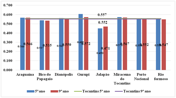 In general terms, in relation to students in the fifth grade of elementary school, it is observed that only the Jalapão micro-region is in the high level of socio-educational inequality (0.00 to 0.499), with 0.450 respectively. The others have a mean level of socioeducational inequality, that is, between 0.500 and 0.799, with the following indices: Araguaína (0.566), Bico do Papagaio (0.537), Dianópolis (0.563), Gurupi (0.605), Miracema do Tocantins, Porto National (0.554) and Rio Formoso (0.558) (Figure 1). The Idsed for students in the 9th grade of elementary school show higher levels of socioeducational inequality than in the 5th grade. The only regions that maintained or improved the level of sócio-educational inequality were the microregions of Araguaína (0.566 in the 5th grade to 0.566 in the 9th grade) and Jalapão, which still continues with a high socio-educational inequality index (0.450 in the 5th grade to 0.471 in the 9th grade). The others increased their levels of socio-educational inequality significantly, and the Gurupi microregion was the one with the highest socio-educational gap among students in the 5th and 9th grades of elementary school. While students of the 5th grade have a rate of 0.605, obtaining the best average among the other microregions, the students of the 9th grade obtained a level of socio-educational inequality of 0.572, that is, increased the level of inequality.