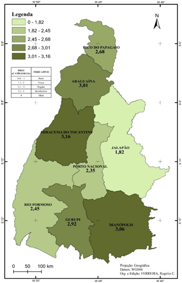 In relation to the students of the 9th grade of elementary school of the state network, it is important to emphasize that the majority already presents a somewhat higher rate, according to the following approach: Araguaína (2,22), Bico do Papagaio (2,20 ), Dianópolis (2,19), Gurupi (2,22), Jalapão (2,12), Miracema do Tocantins (2,22), Porto Nacional (2,28) and Rio Formoso (2,22) (see Chart 2). It can be observed that, although the indexes were slightly higher in relation to the 5th grade and in relation to the Tocantins' average (except the Jalapão microregion), being at a satisfactory level, it is in this level of schooling that the students present greater school failure, according to data from Inep.15 This school failure in the last grades of elementary school is worrying, since it jeopardizes the future prospects of the youth as a citizen. Regarding the discussion about the second class of the Idsed indicators, Figure 2 presents the Infrastructure and Resources Indicator map. This indicator has six variables (dependencies, services, equipment, technology, accessibility and pedagogical organization), in which, following the weighted average calculations, the following information is presented: Araguaína (3.01), Bico do Papagaio, Dianopolis (3.06), Gurupi (2.92), Jalapão (1.82), Miracema do Tocantins (3.16), Porto Nacional (2.35) and Rio Formoso (2.45). It is observed that of the eight microregions, three have a satisfactory level of infrastructure (Araguaína, Dianópolis and Miracema do Tocantins), four have a regular level (Bico do Papagaio, Gurupi, Porto Nacional and Rio Formoso) and only one, in this case, the microregion of the Jalapão, presents weak level. Taking into account the Tocantins' average, which is 2.75 (regular), we can see that the regions that are most fragile infrastructural are the microregions of Jalapão, Bico do Papagaio, Porto Nacional and Rio Formoso. Consequently, Jalapa’s microregion is negatively affected by the vulnerability of socioeconomic and sociocultural aspects, and now of the infrastructural ones. The reality presented by this region instigates us to reflect on some issues related to public policies. Have federal, state and municipal managers also been able to see this reality? Are there projected public policies planned to minimize these social impacts in this region? The data presented do not allow us to state that there are no public policies for this purpose for this region. Figure 3 shows the map of the Schooling Indicator, an element of great importance for crossing with previous information. This indicator has four variables, three of which portray school failure (Distortion age/grade, dropout, and disapproval), and one depicts the percentage of full-time teachers. This figure includes the following information: Araguaína (2,80), Bico do Papagaio (2,60), Dianópolis (2,60), Gurupi (2,80), Jalapão (2,40), Miracema do Tocantins 60), Porto Nacional (3.00) and Rio Formoso (3.00).16
